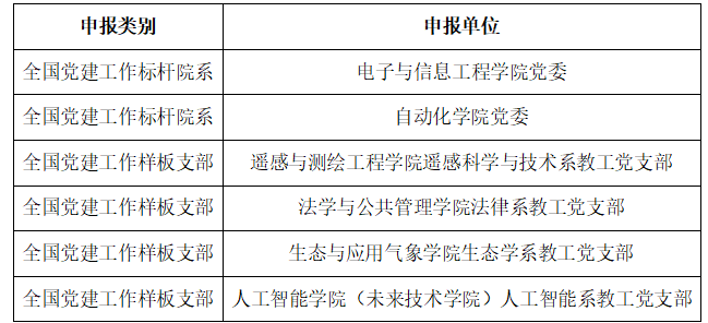 根据《教育部办公厅关于开展第五批新时代高校党建示范创建和质量创优工作的通知》(教思政厅函〔2025〕18号)精神,按照省委教育工委相关通知要求,经基层党组织申报、资格审查、专家评审,我校拟推荐申报第五批全国党建工作标杆院系2个、样板支部4个。现将名单予以公示,具体如下:
